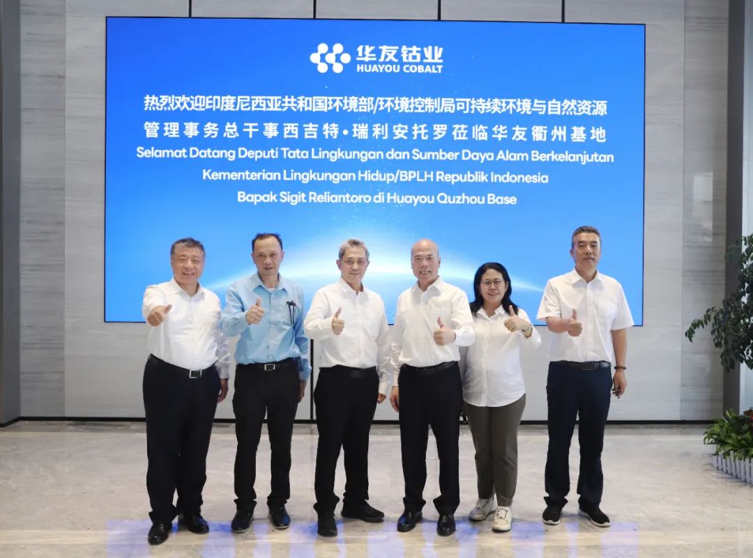 On August 24, H.E. Sigit Reliantoro, Director General of Sustainable Environment and Natural Resources Management at Indonesia’s Ministry of Environment/Environmental Control Bureau, led a delegation to visit Huayou Quzhou Base. Chen Xuehua, Chairman of Huayou Holding Group, jointly hosted the visit with Yang Jianqiang, Party Secretary and Chairman of CITIC Construction, and their teams. Representatives from all three parties held discussions centered on sustainable development and explored collaborative opportunities.