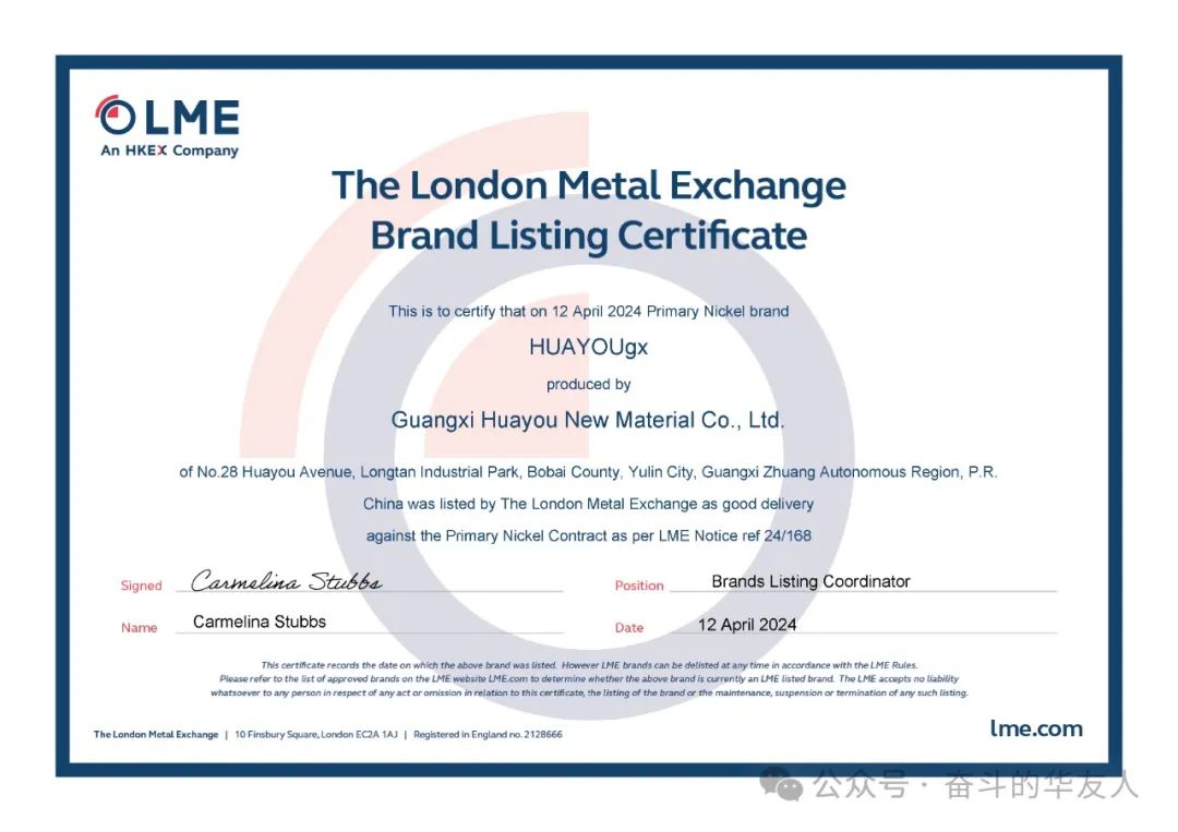 又一标记性效果!“HUAYOUgx”牌电解镍在LME注册乐成